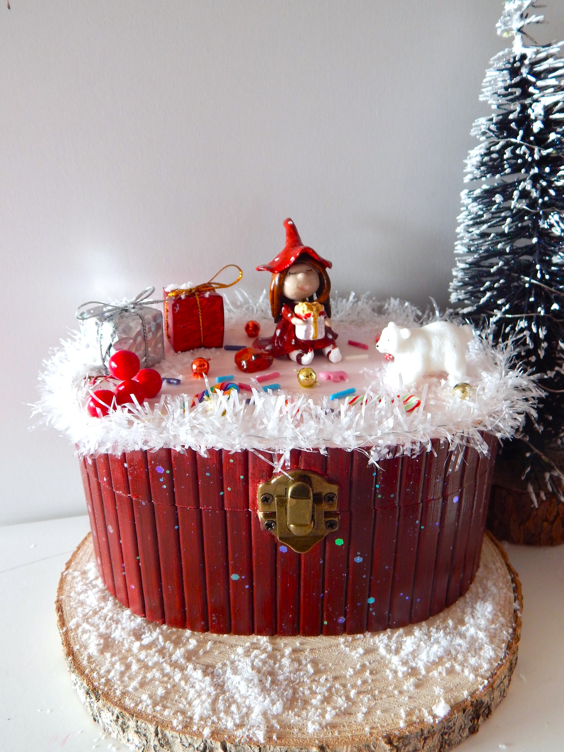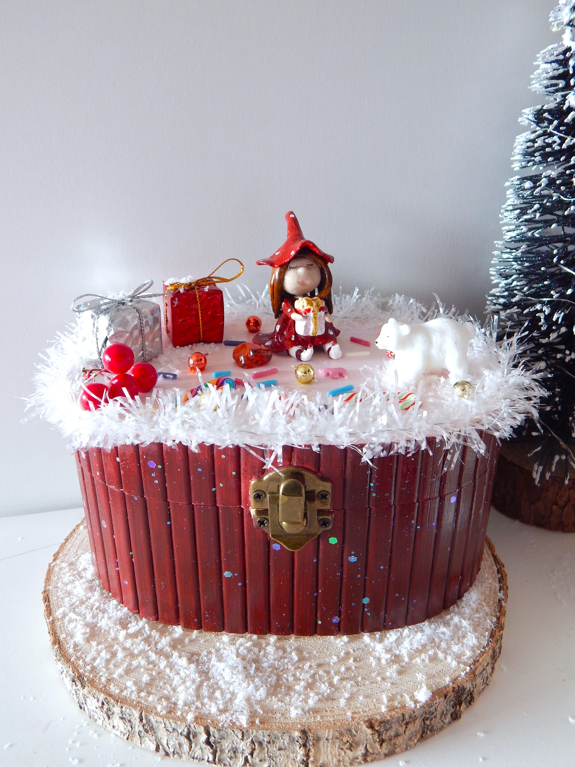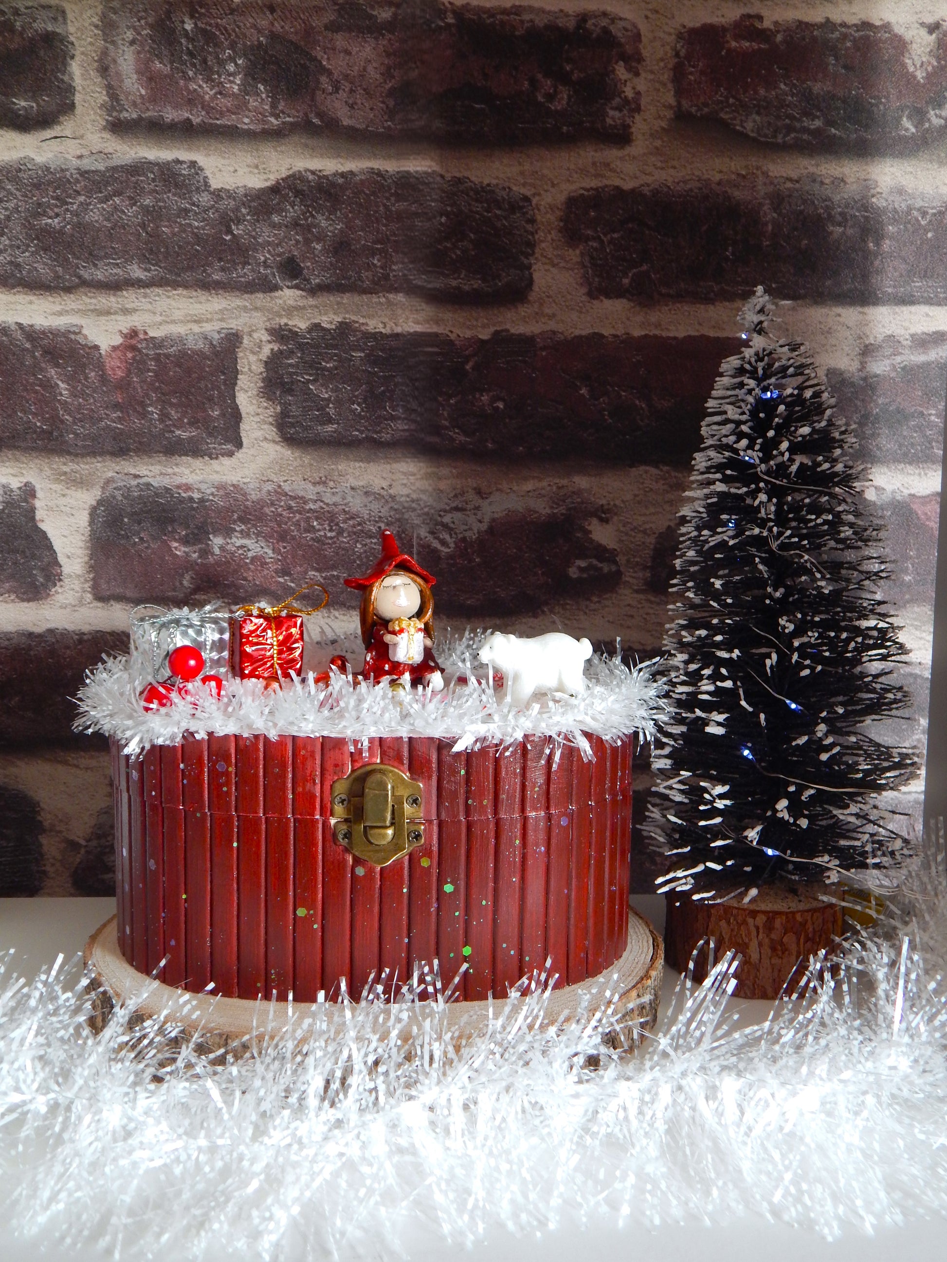 Boîte bordeaux avec sa neige paillettée. Camélia adore Yule, c'est sa fête préférée! Elle attend patiemment de savoir quelle surprise lui offre cette fin d'année.