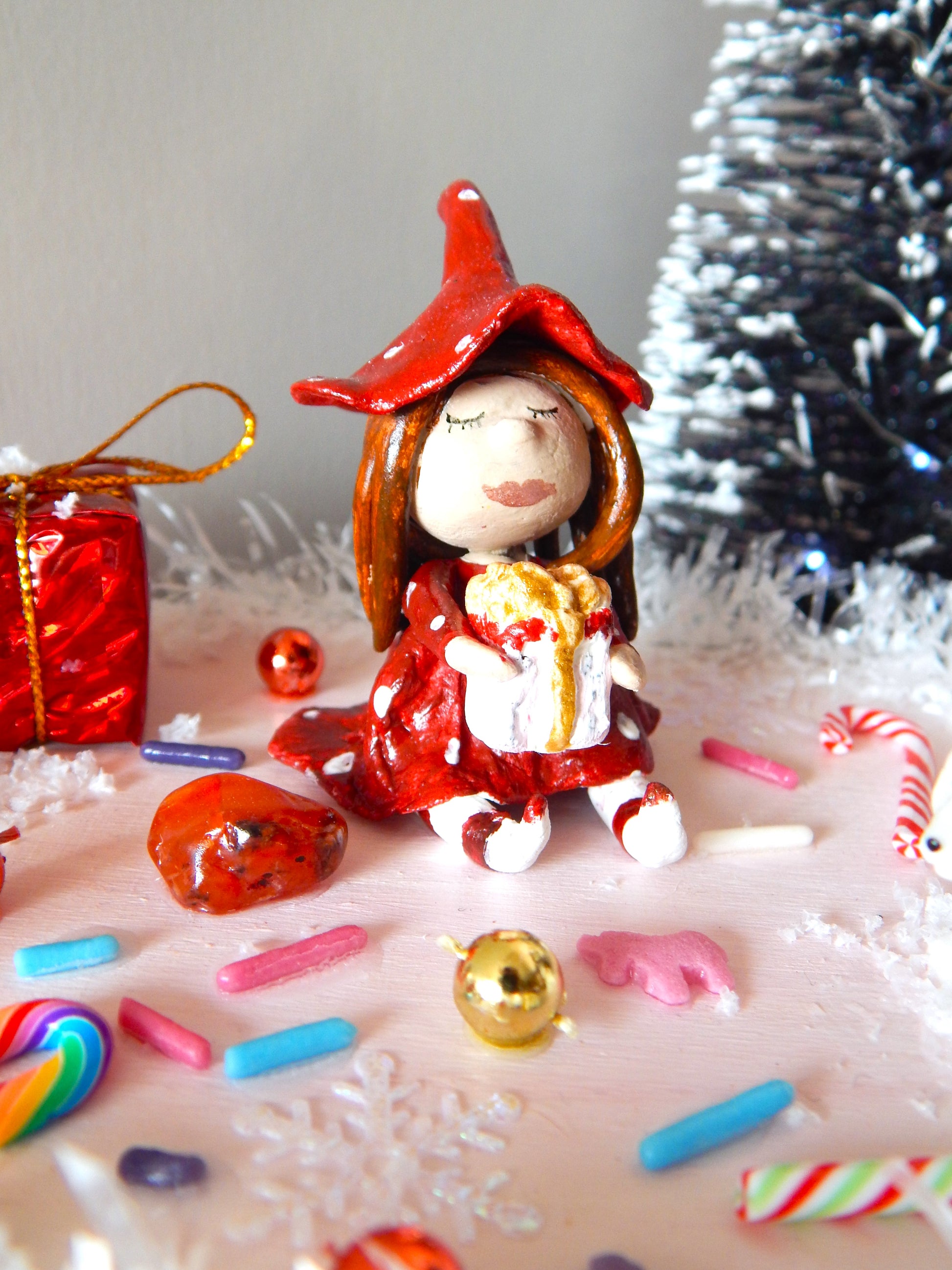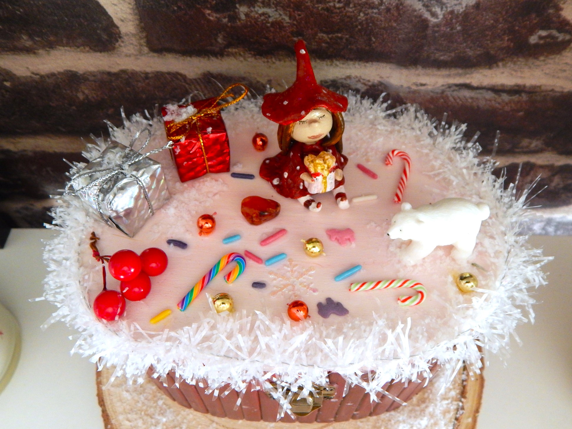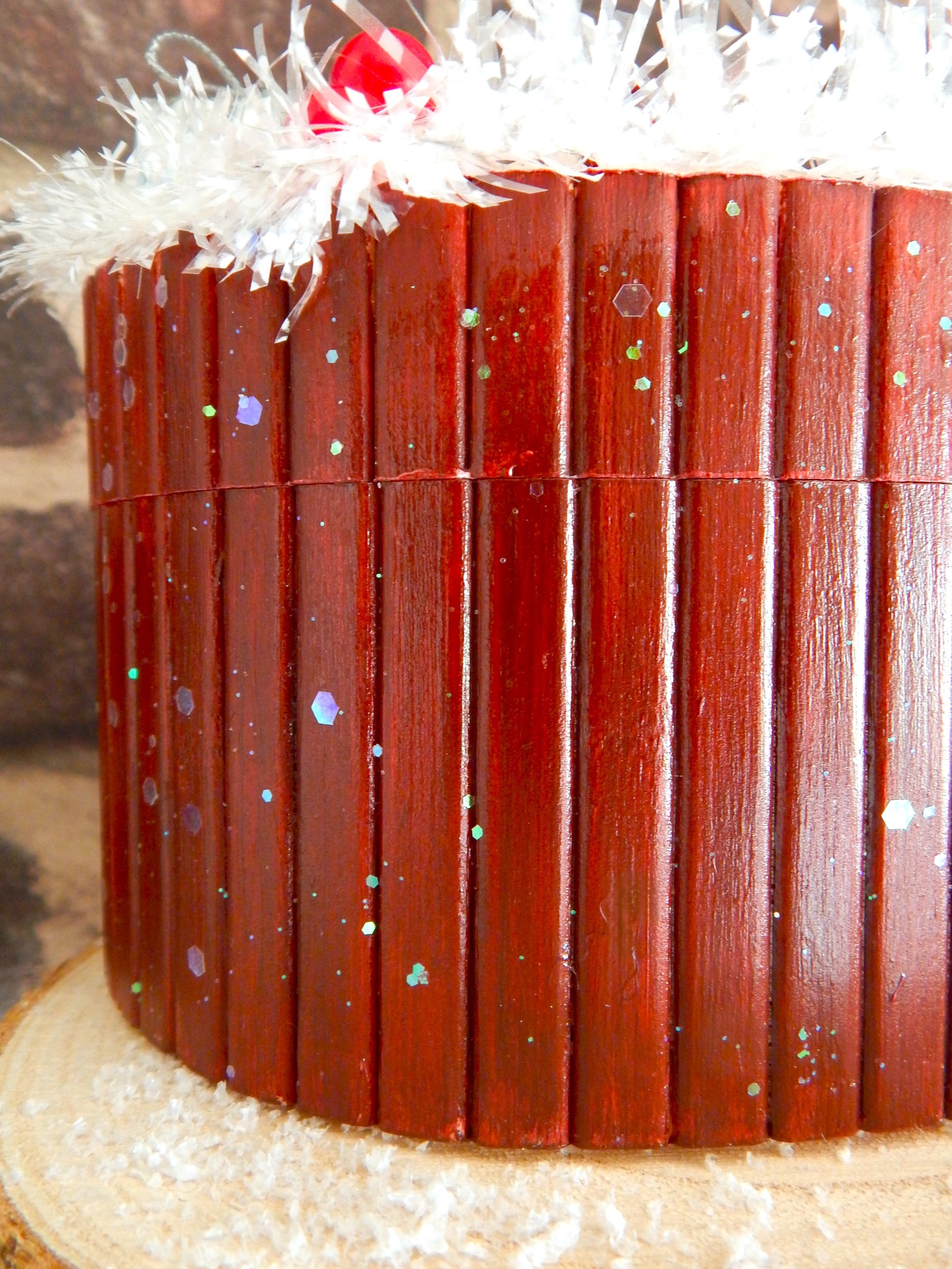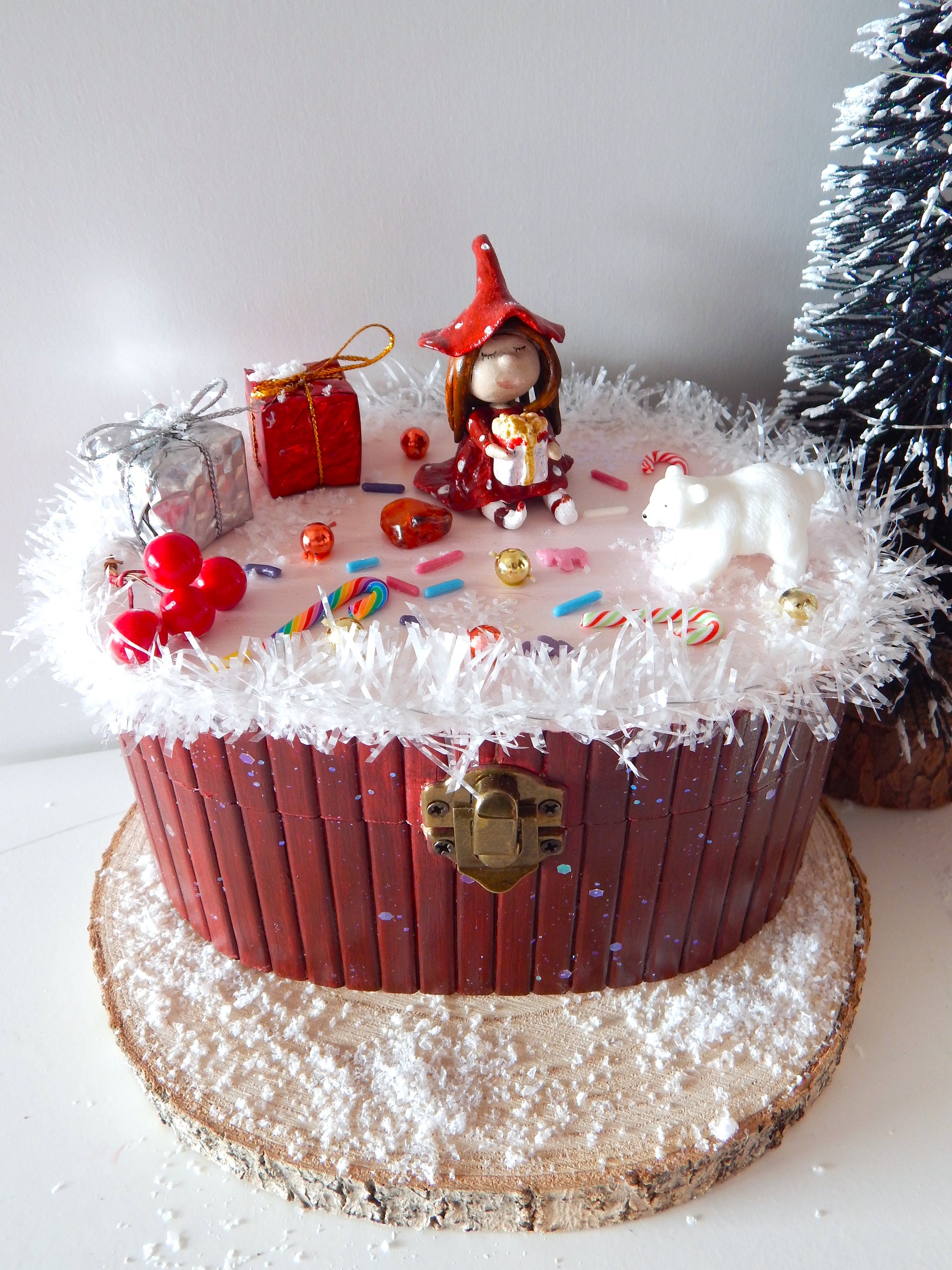 Boîte bordeaux avec sa neige paillettée. Camélia adore Yule, c'est sa fête préférée! Elle attend patiemment de savoir quelle surprise lui offre cette fin d'année.