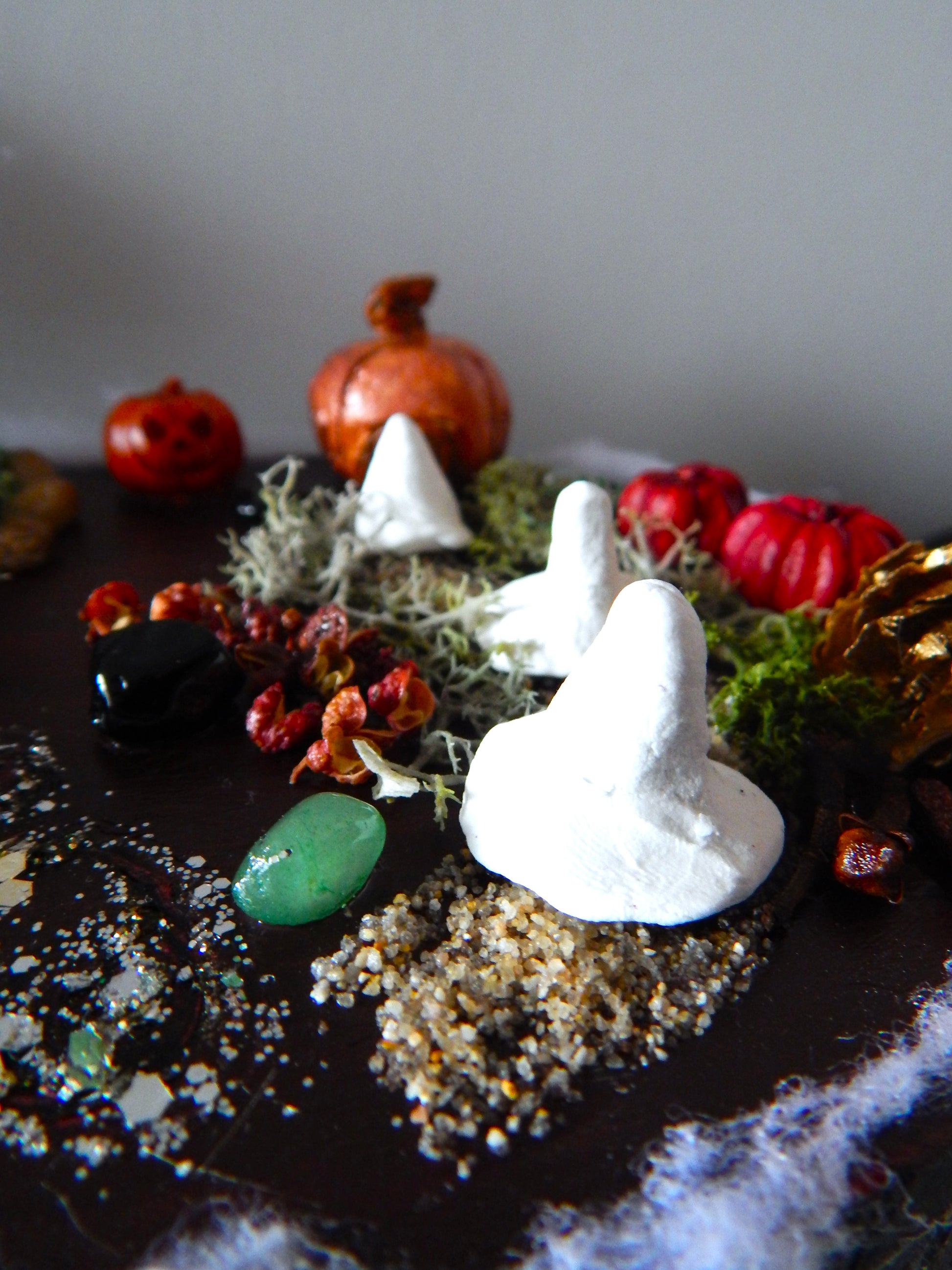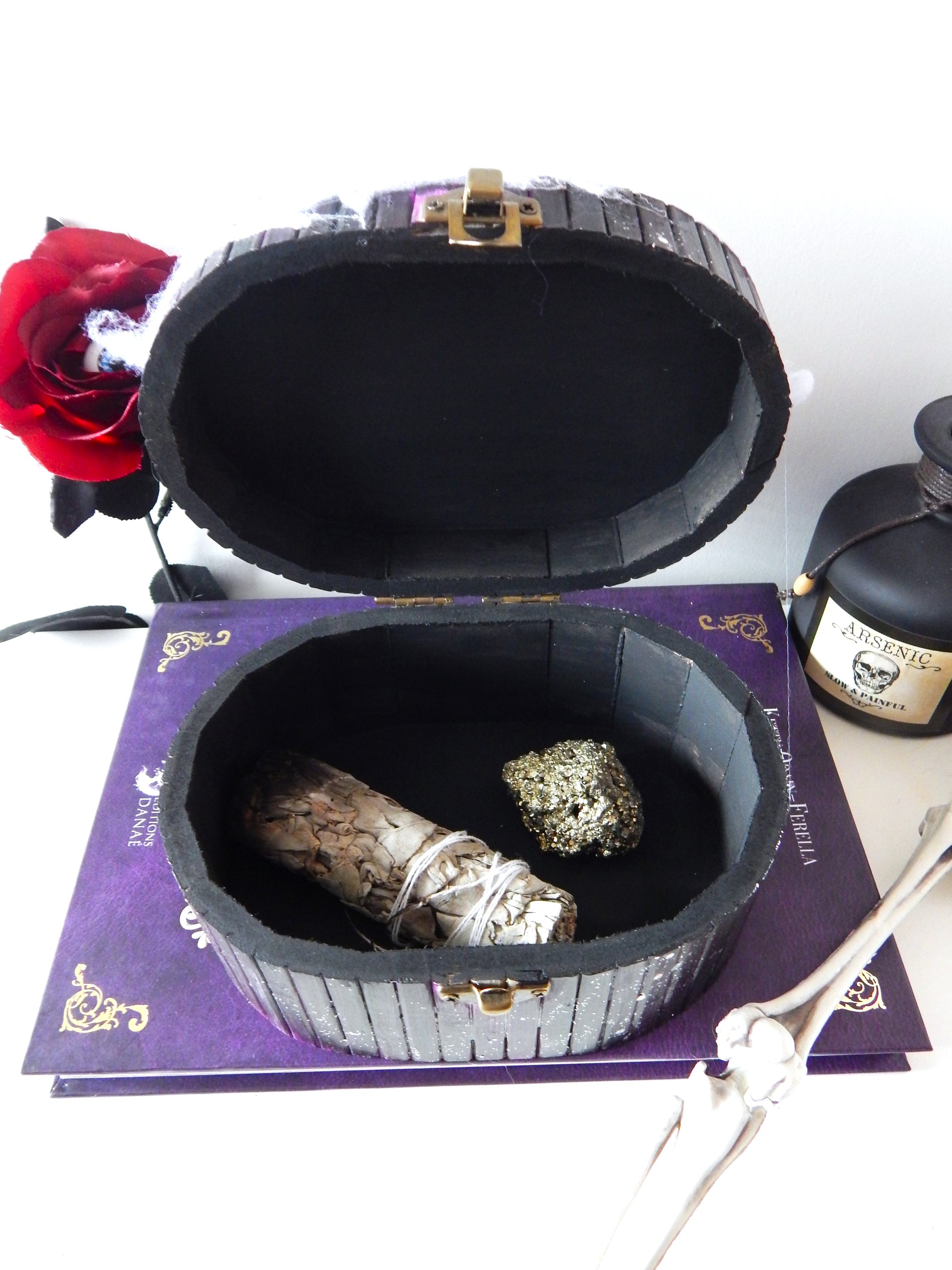 Samhain, fête ancienne où les voiles (ou les toiles d'araignés) entre les mondes deviennent plus fins. Avec cette boîte, les âmes errantes peuvent retrouver leur chemin. L'aventurine et l'obsidienne sauront vous protégez et guider vos lanternes. Qu'allez vous mettre dans votre boîte? Des offrandes pour les esprits qui vous hantent?