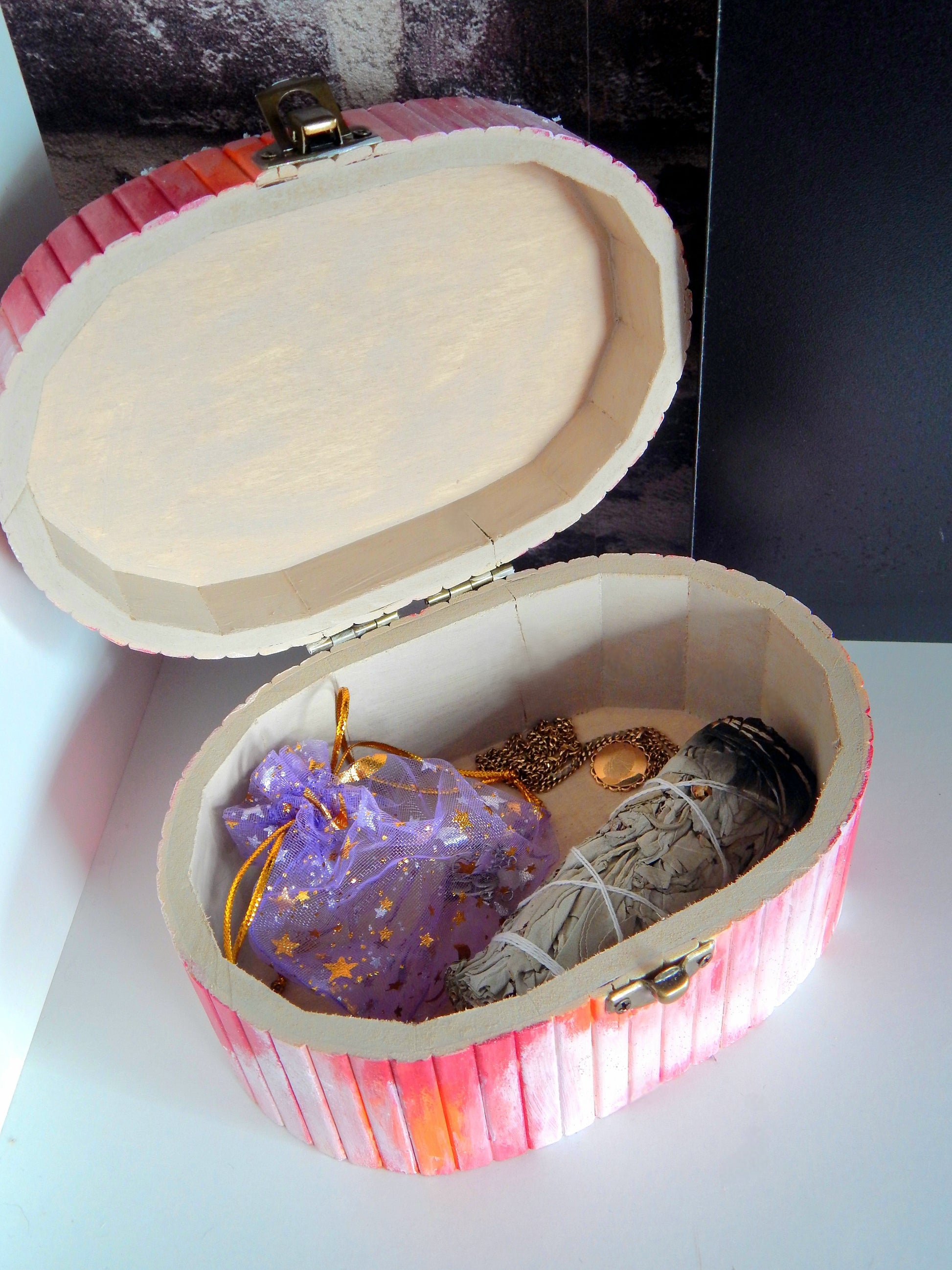 Cette boîte peut être utilisée comme objet de décoration, un petit autel personnel ou comme écrin pour vos objets magiques : pierres, intentions écrites, bijoux, herbes séchées,...