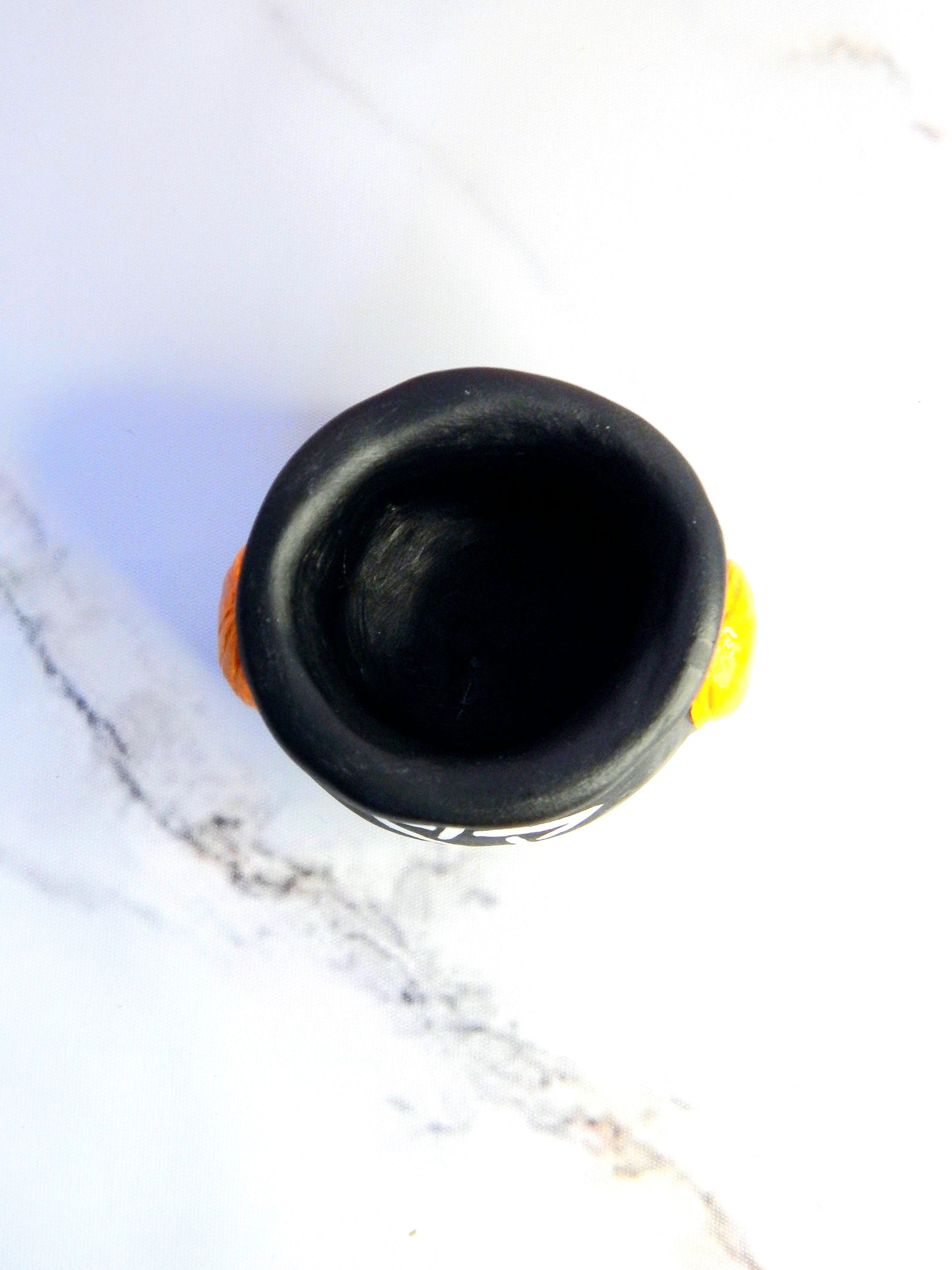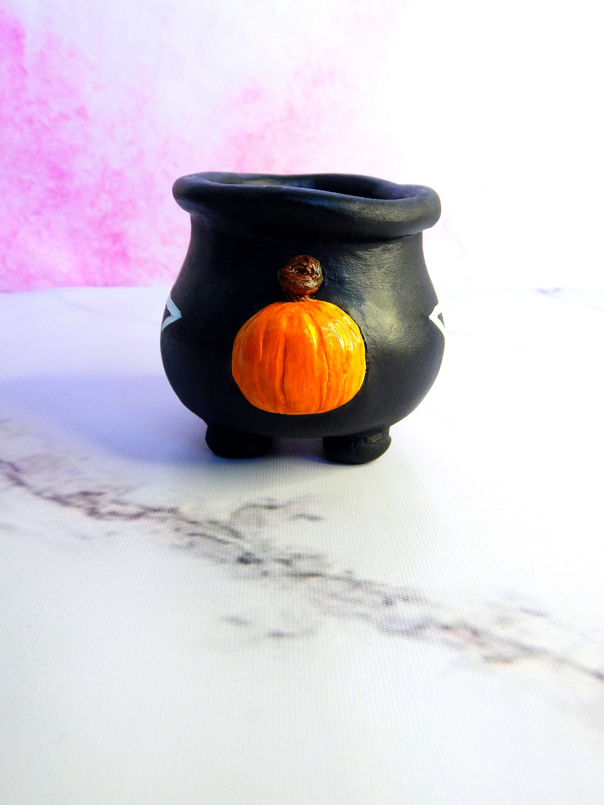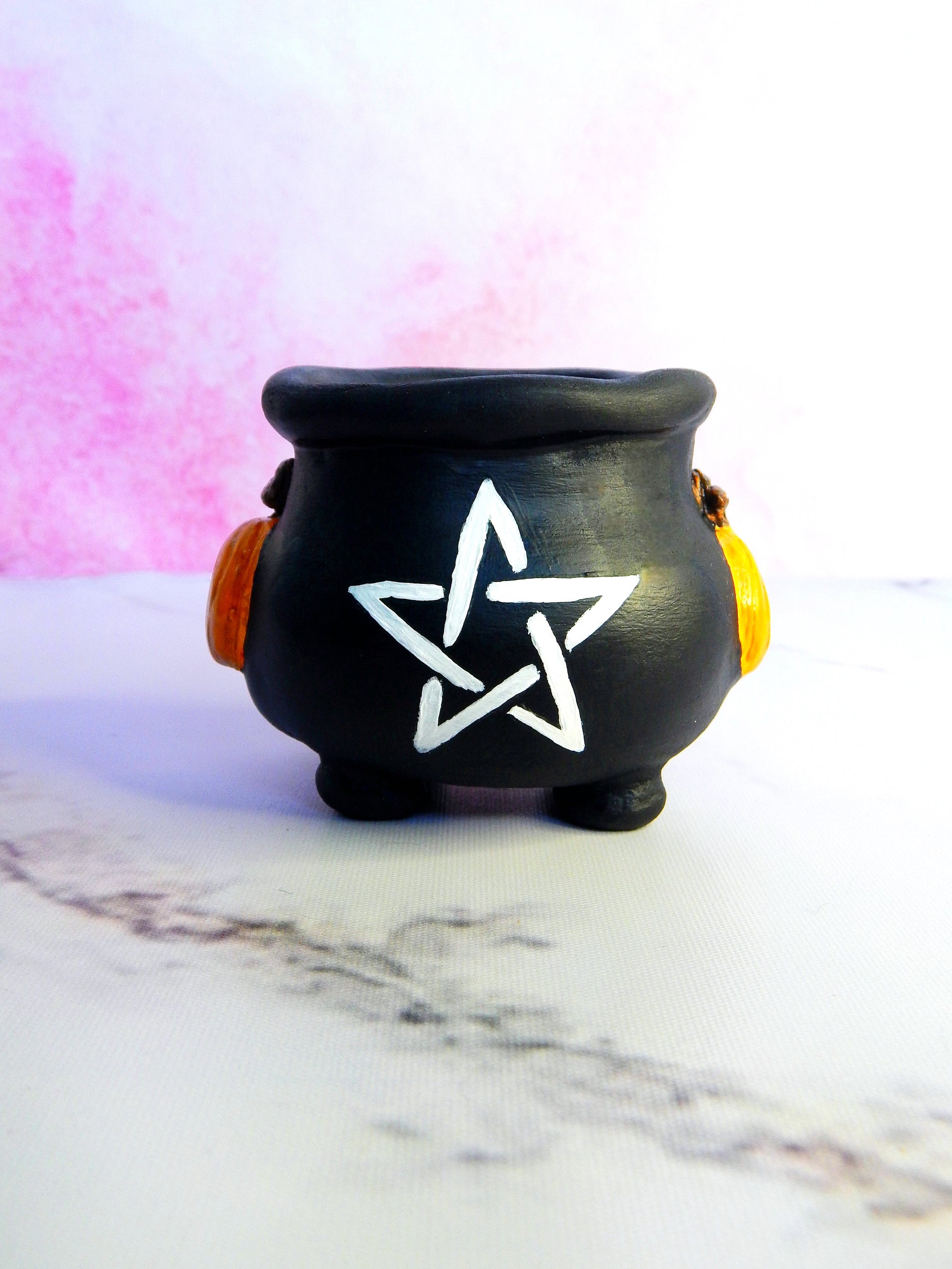 Petit chaudron pentagramme décoratif façonné et peint à la main. Accompagné de citrouilles, il attira les plus witchy d'entre vous...