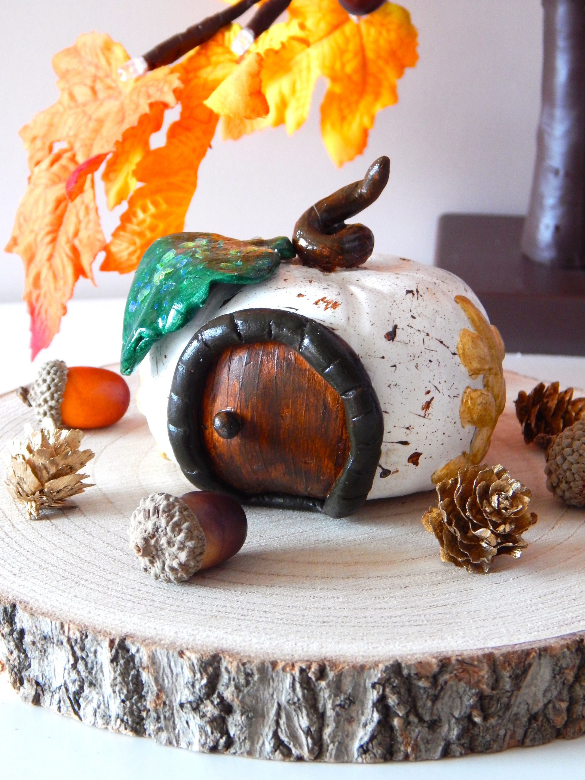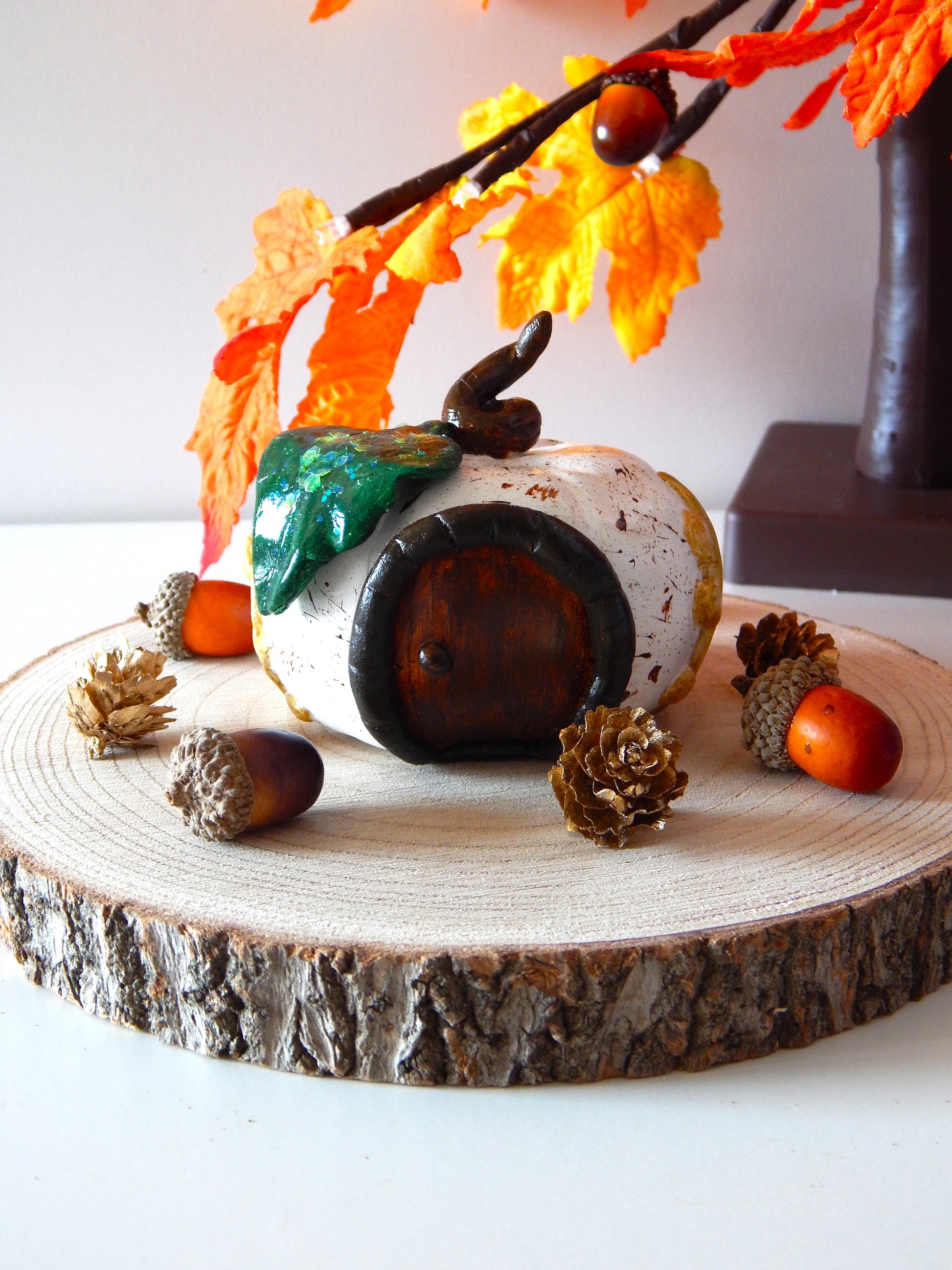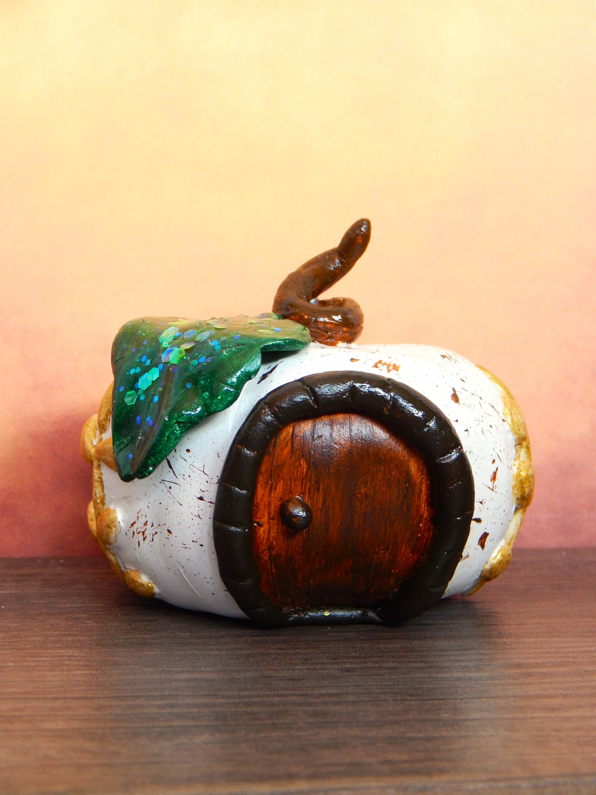En se promenant dans les bois, on peut parfois tomber sur des cabanes enchantées. Celle-ci, en forme de citrouille, est élégante et raffinée avec sa feuille verte pailletée. Elle trouvera parfaitement sa place dans votre intérieur, qu'il soit moderne ou boisé.