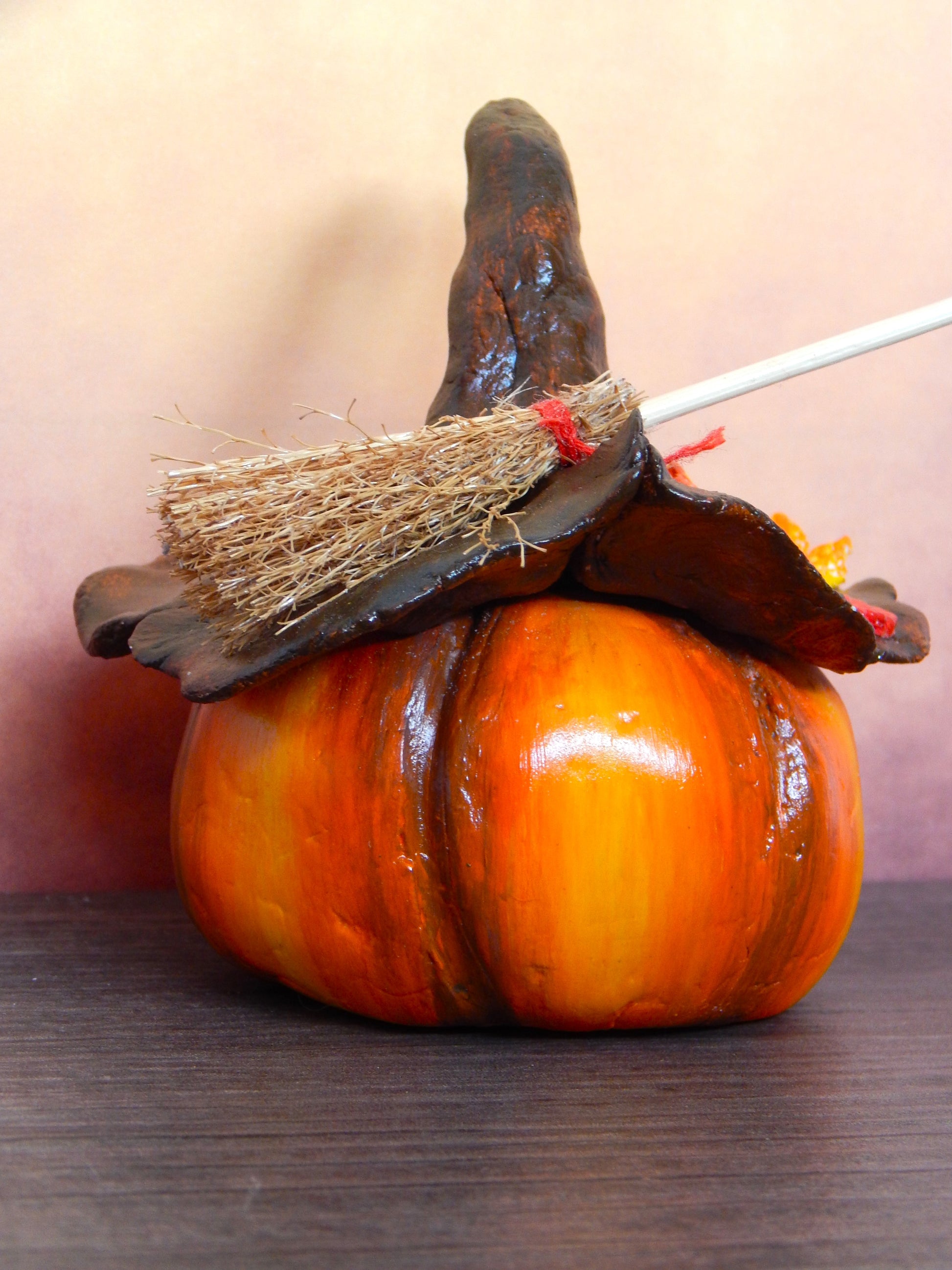 Peinte dans des tons chauds, elle est plus volumineuse que ses sœurs et a mis son plus beau chapeau. Cette citrouille de sorcière est parfaite pour célébrer le Sabbat de mabon.