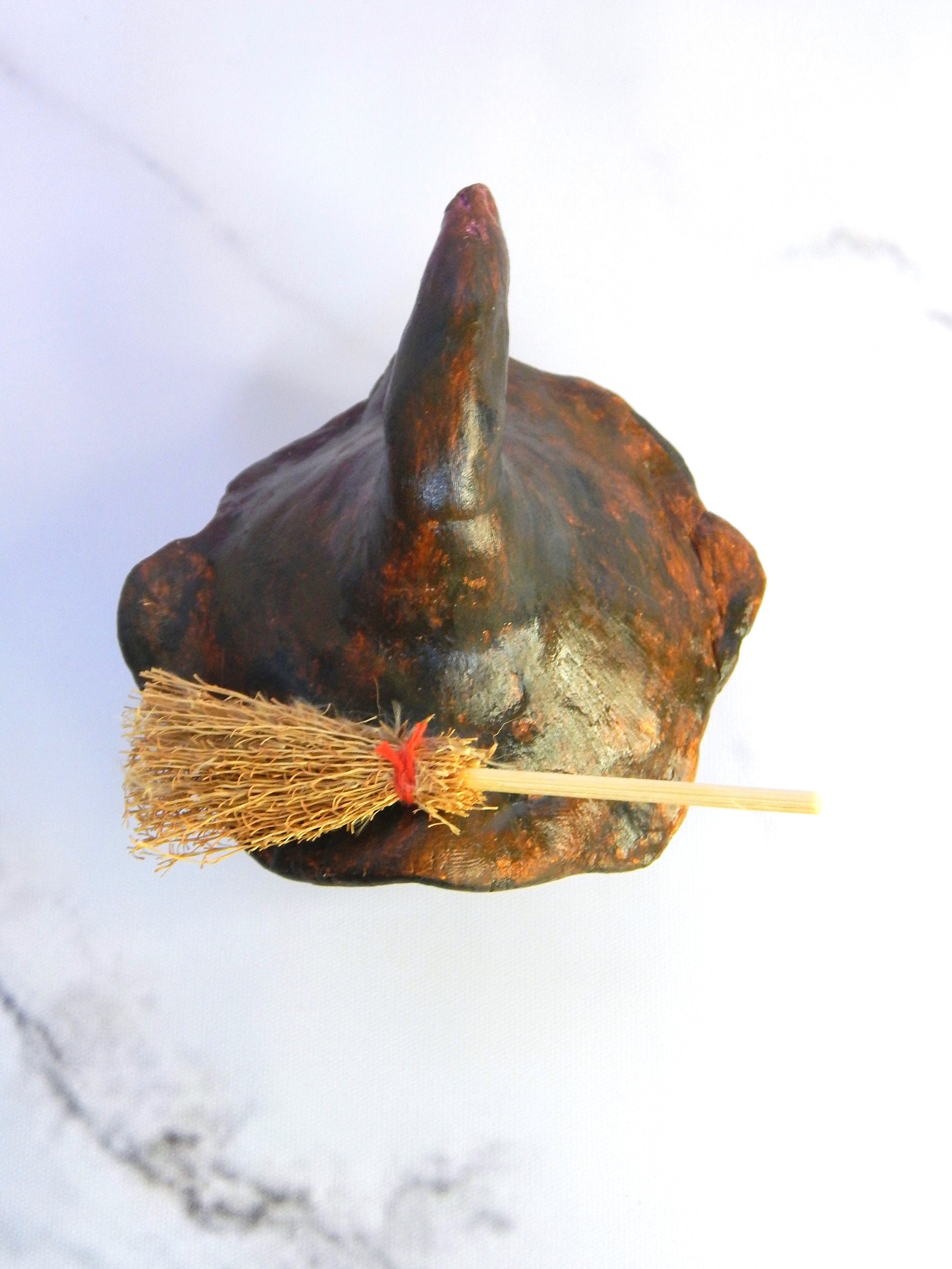 Petite citrouille de sorcière faite à la main. Vêtues de leur plus beau chapeau et accompagnées de leur fidèle balais, chaque citrouille est unique pour une âme 100% artisanale.
