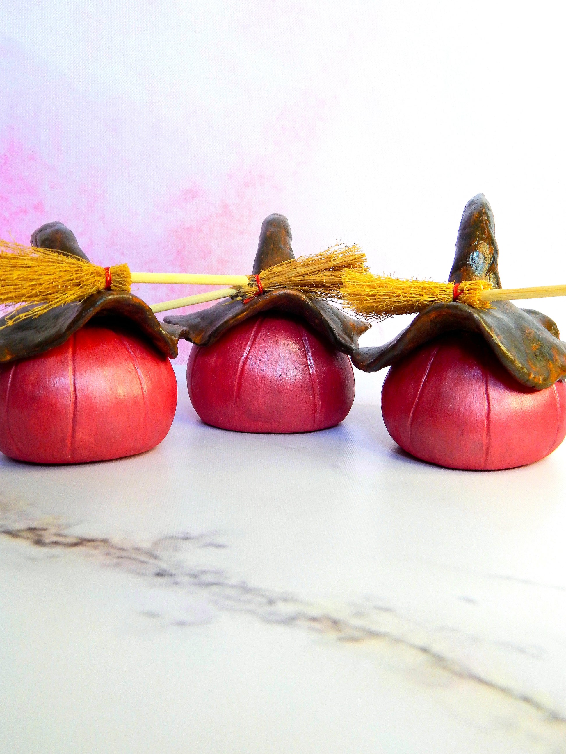 Petite citrouille de sorcière faite à la main. Vêtues de leur plus beau chapeau et accompagnées de leur fidèle balais, chaque citrouille est unique pour une âme 100% artisanale.