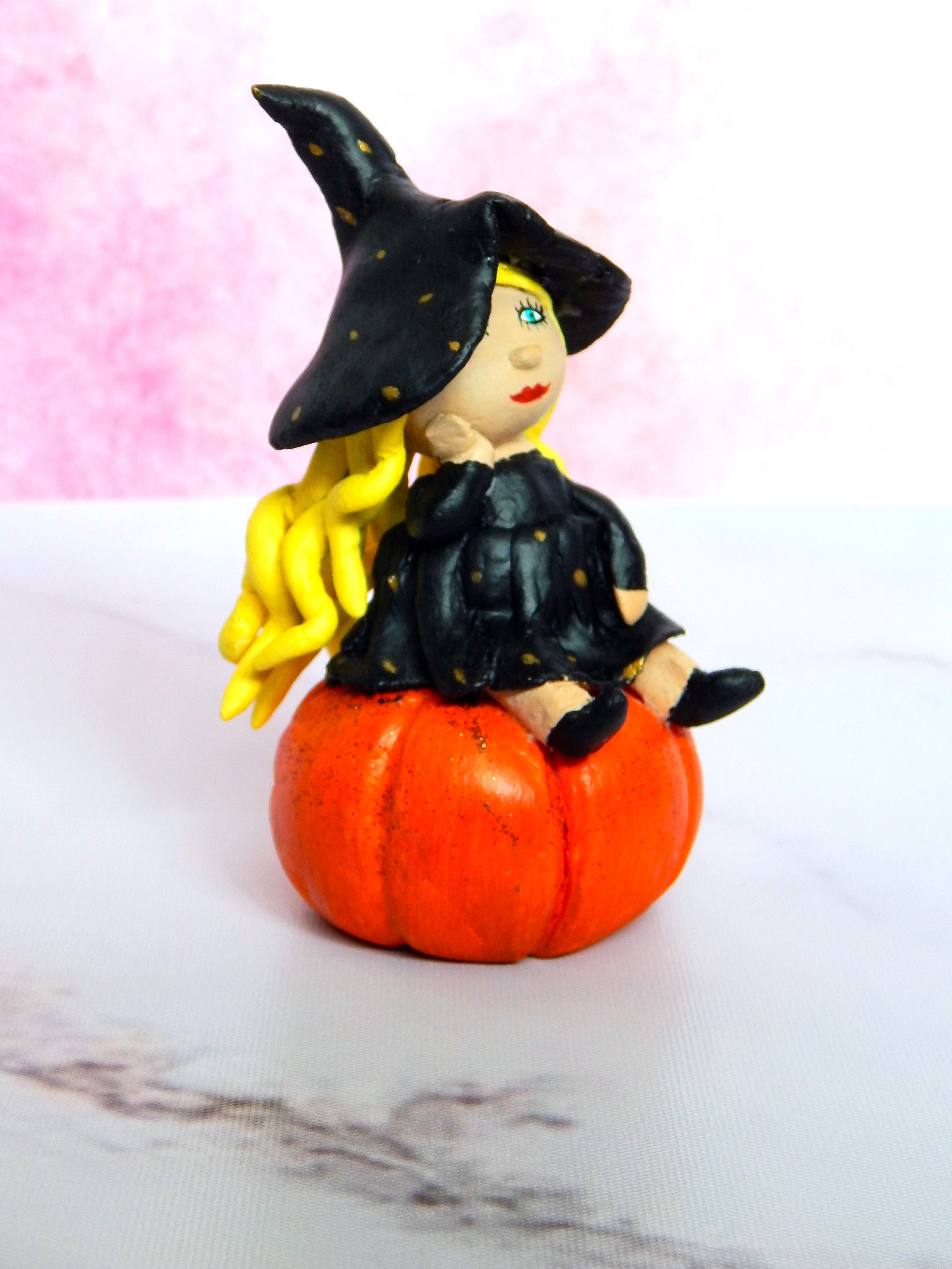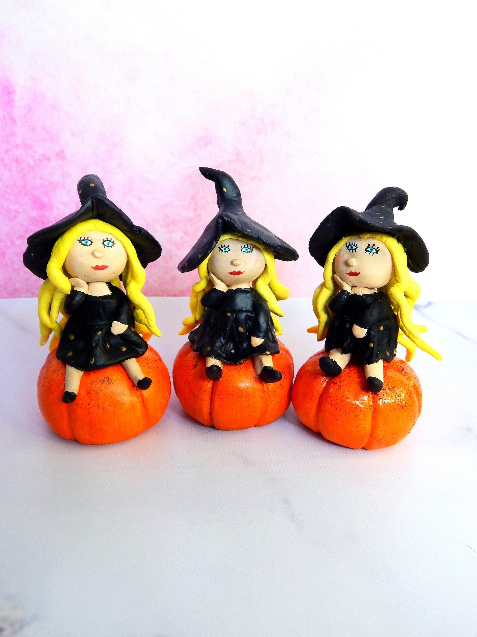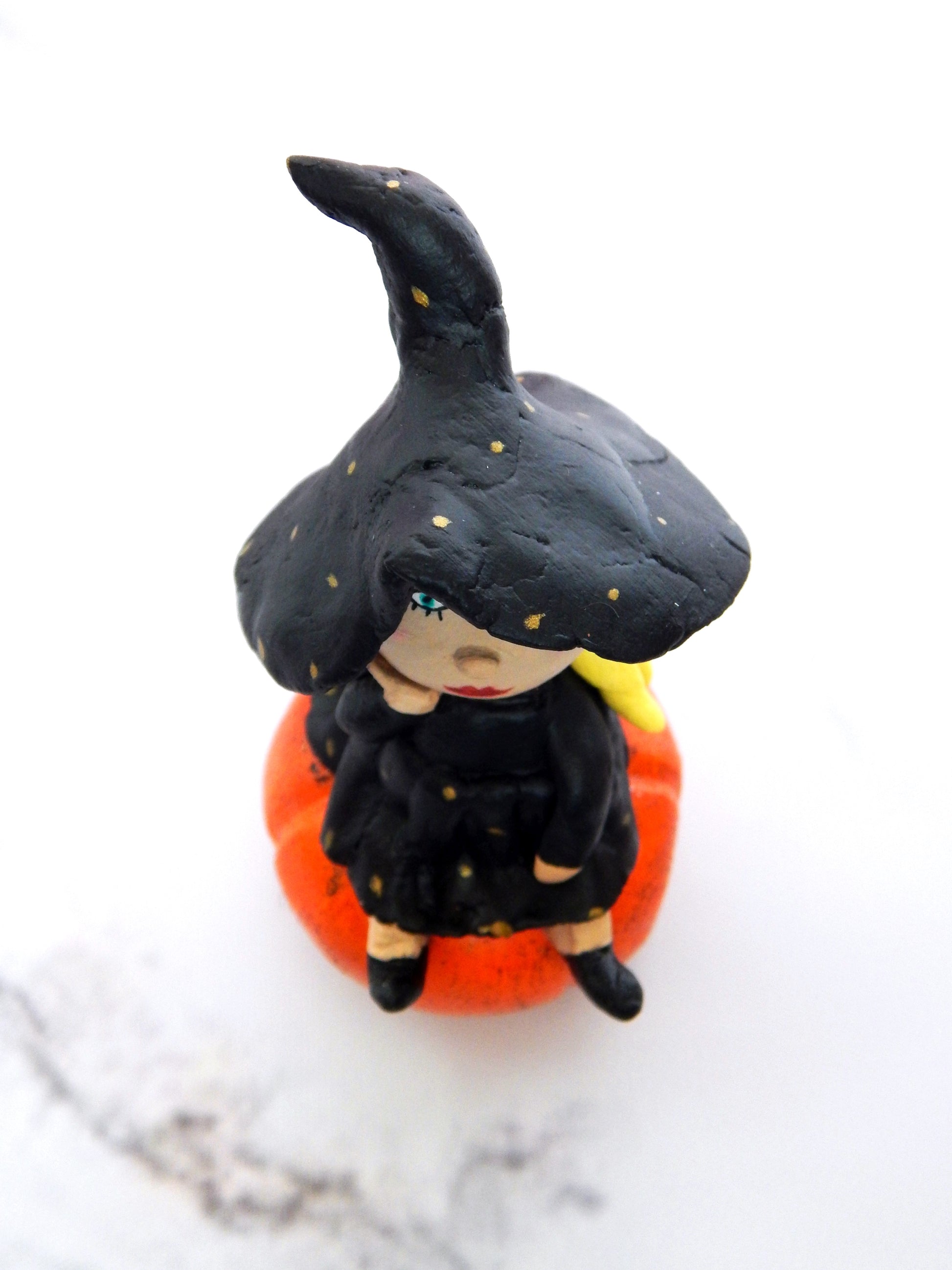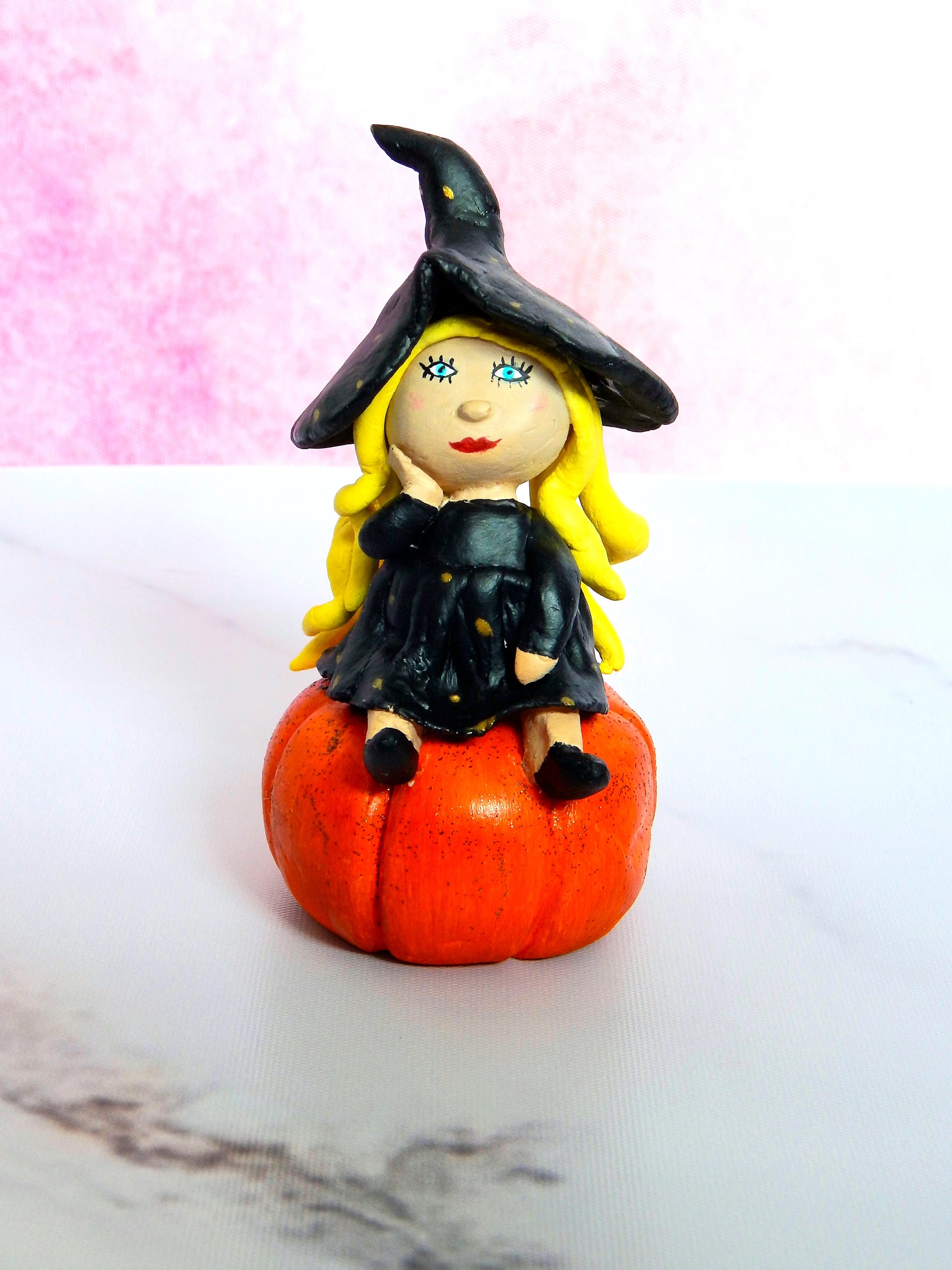 La petite sorcière Ella, vêtue comme ses soeurs de sa robe et son chapeau noir à pois dorés, a la tête dans les étoiles et les bottes dans les feuilles mortes. Un peu rêveuse, elle passe son temps à chuchoter des secrets à sa citrouille orange pailleté. Elle attend l'hiver avec impatience pour hiberner !