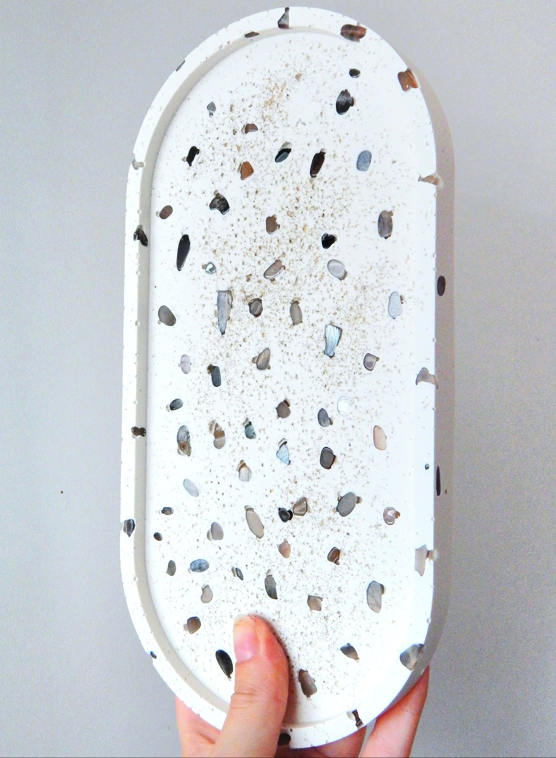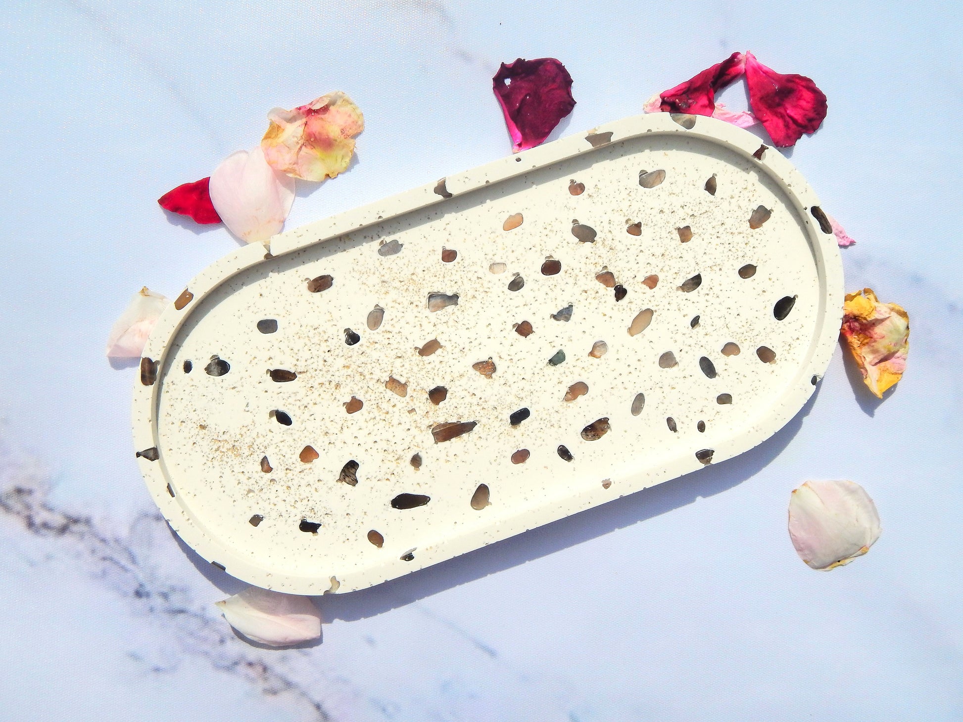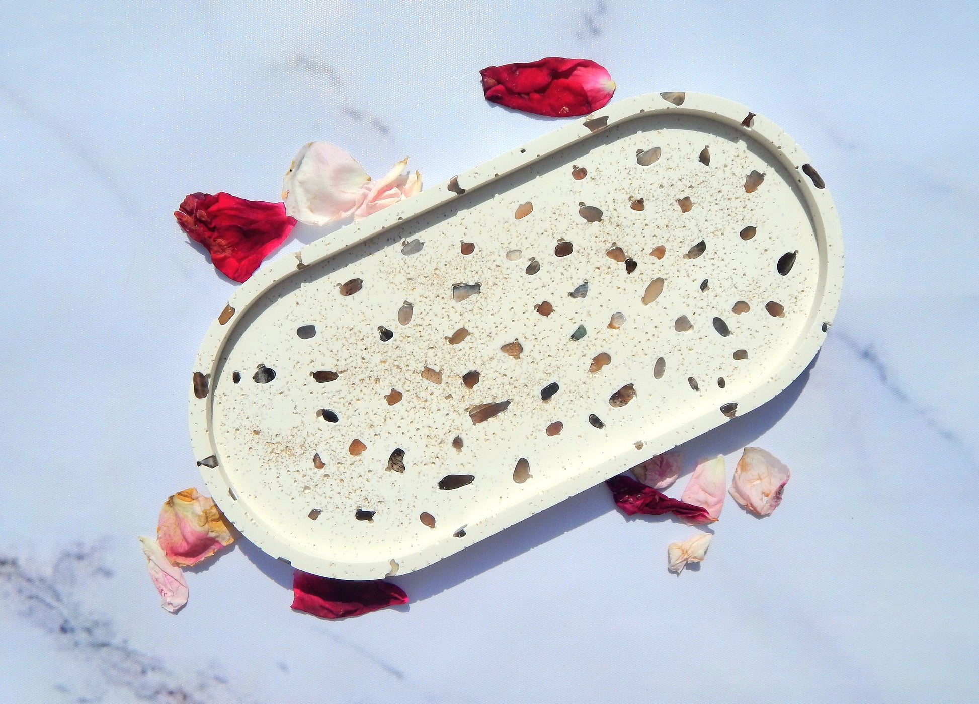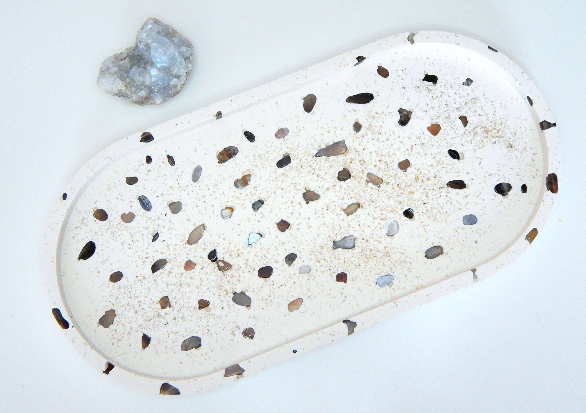 Plateau sablé, incrusté de pierres naturelles. La pierre de soleil noir active le chakra racine, apportant ancrage, protection et force intérieure. Elle stimule aussi le chakra solaire, renforçant la confiance en soi, la vitalité et la joie de vivre. Physiquement, elle aide à réduire le stress, favorise la détente musculaire et soutient le système digestif.