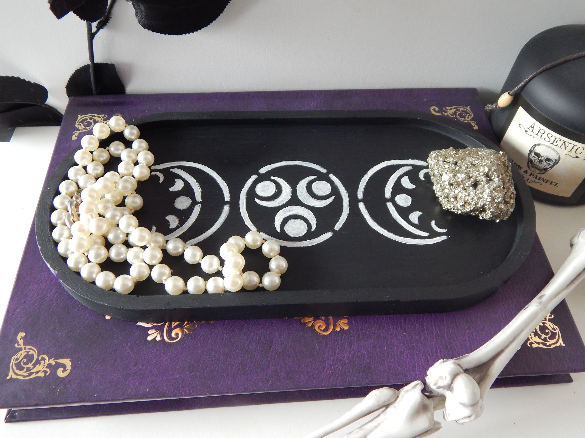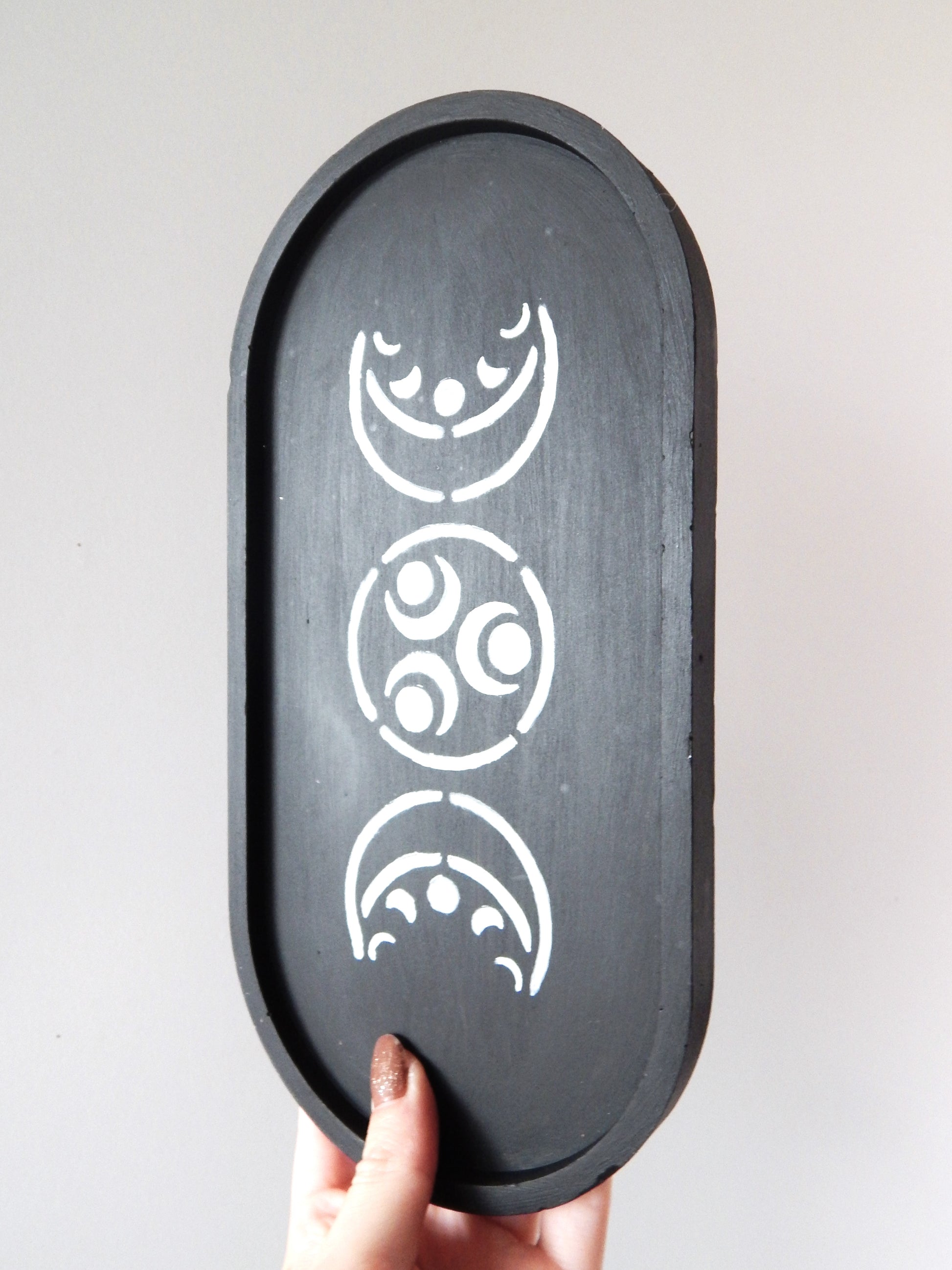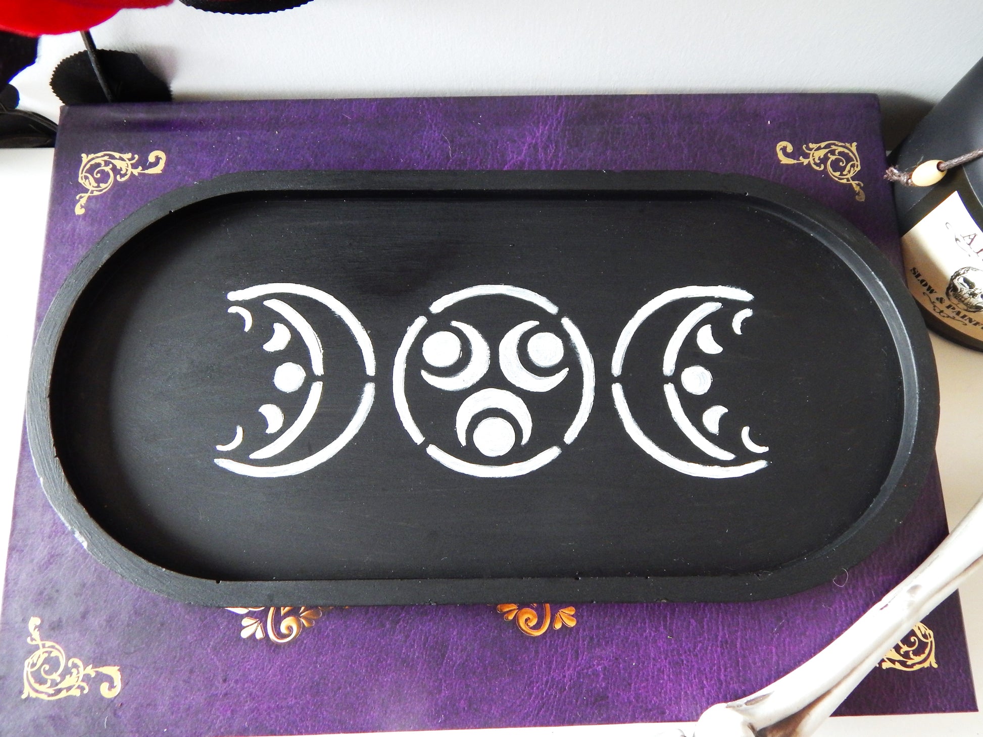 Ce plateau noir a pour symbole la triple lune. En lien avec Samhain, fête celtique qui marque la fin de l'année et l'entrée dans la saison sombre, il rappelle que mort et renaissance sont indissociables : on honore les fins tout en préparant la renaissance future, le retour à la lumière. La partie décroissante de la Triple Lune représente la mort, la fin des cycles et la sagesse.