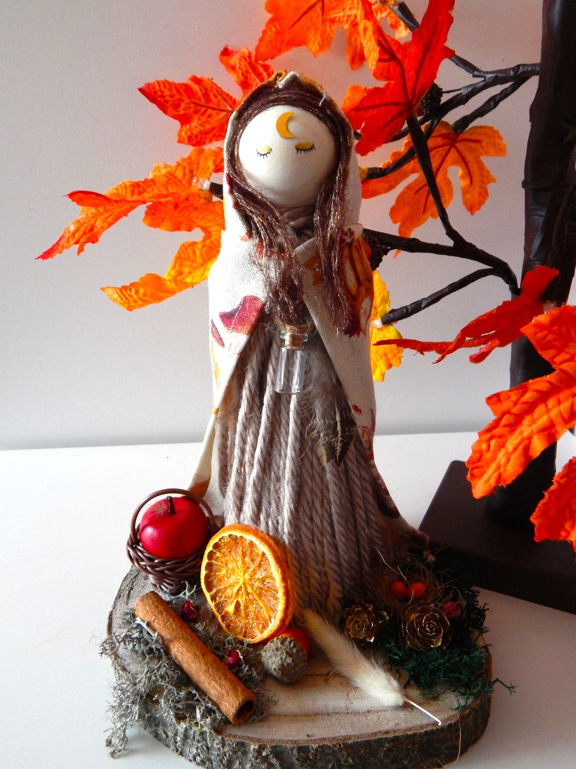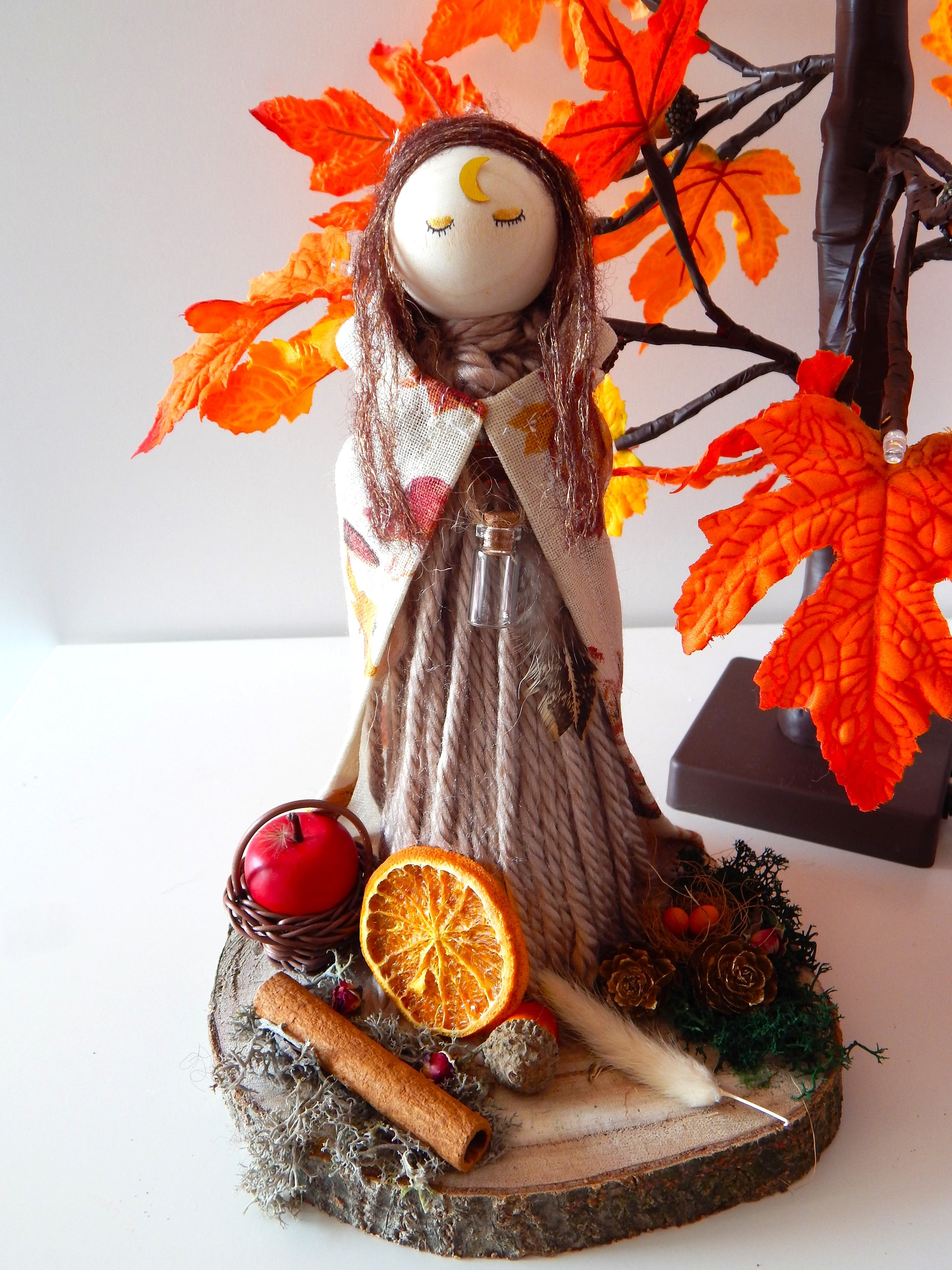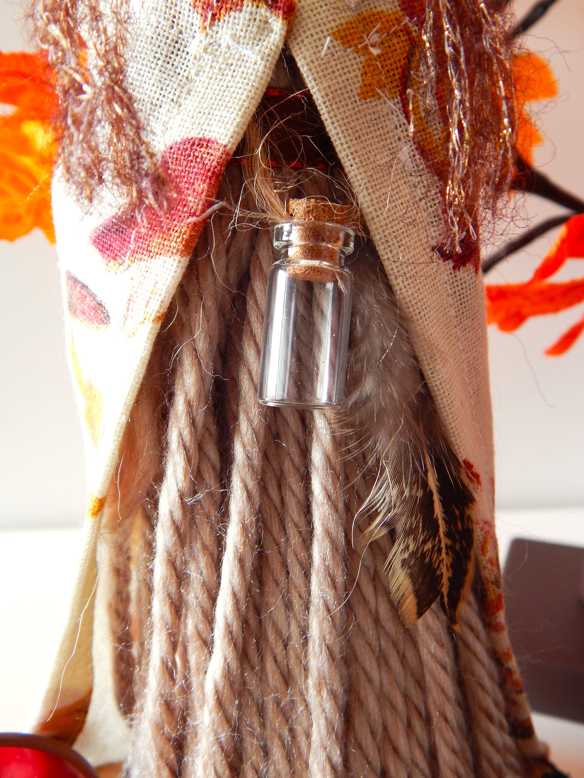 Gardienne de l’abondance, Elle vous invite à être gratifiant.e.s pour ce que votre maison reçoit : nourriture, chaleur, petits bonheurs du quotidien. Dans sa fiole, vous pouvez y mettre ce que vous voulez : un petit mot, des herbes, des paillettes... Sa présence sur votre cheminée ou votre buffet rappelle la beauté et le calme de l’automne, invitant à ralentir, à profiter des moments simples et à se reconnecter avec la nature même à l'intérieur. Elle inspire le respect et l’attention envers les animaux de votre foyer.